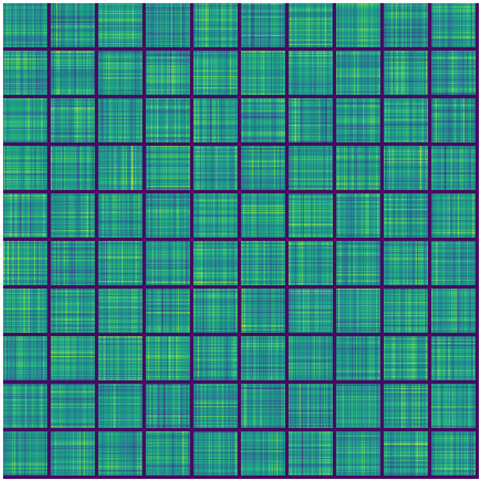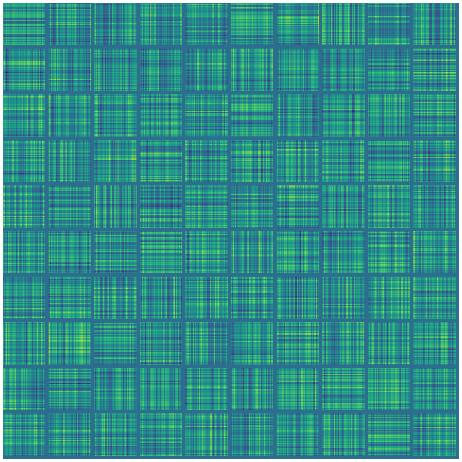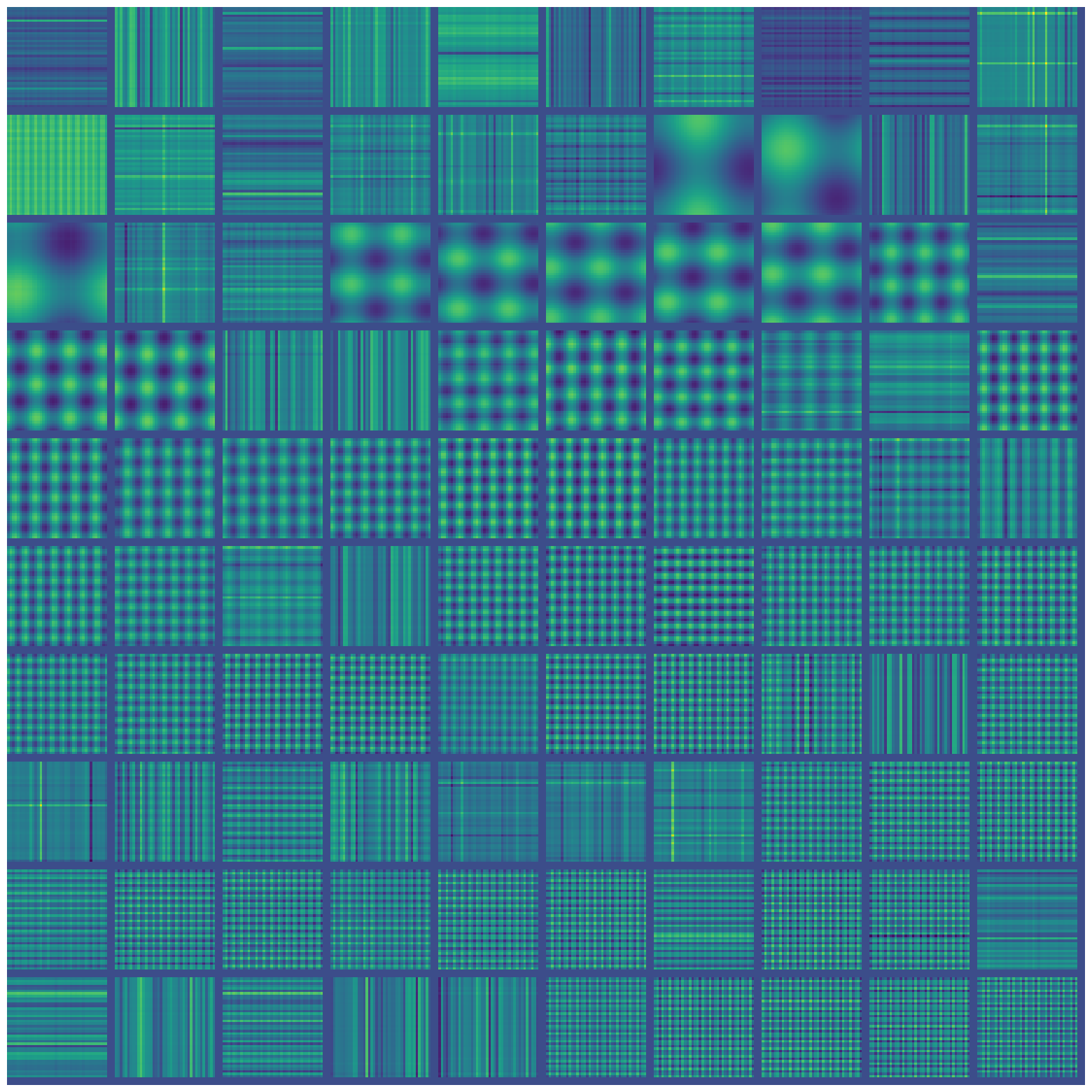 We see that the learned neural network is probably doing some Fourier transform. This can be confirmed by plotting the activation map on every hidden neuron. Specifically, for each hidden neuron, we can calculate its activation for each of the N\times N possible inputs. This is plotted as a heatmap with N\times N pixels. We then get one heatmap per hidden neuron and display all of them in a grid: