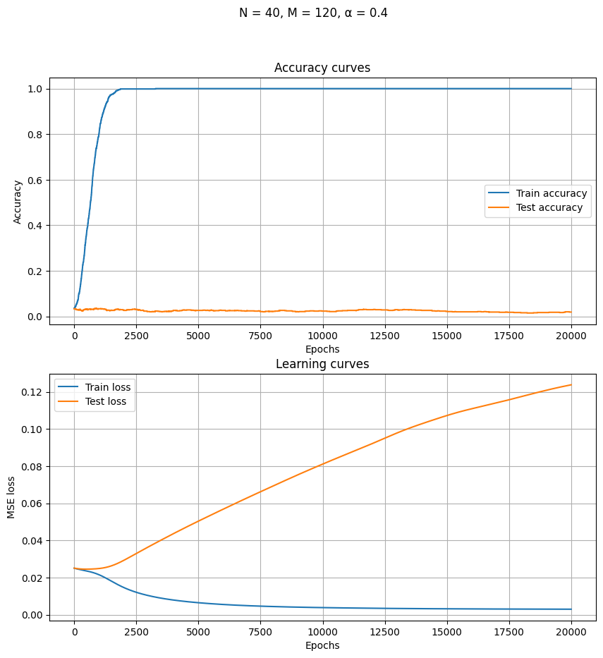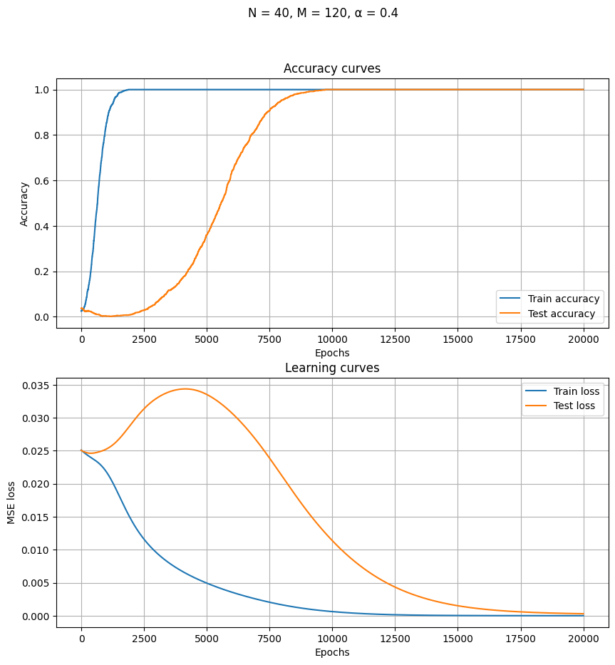 • The test set accuracy curve rises only after the training set accuracy is perfect. First slowly, then rapidly (“grokking”). This can be quite puzzling, since if the network has really achieved perfection on the training set, then there is nothing left to learn, and so it shouldn’t be able to improve any further – and yet it does improve.