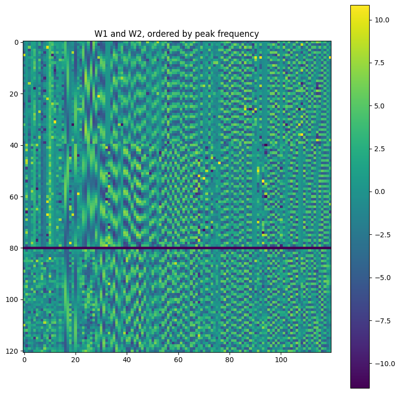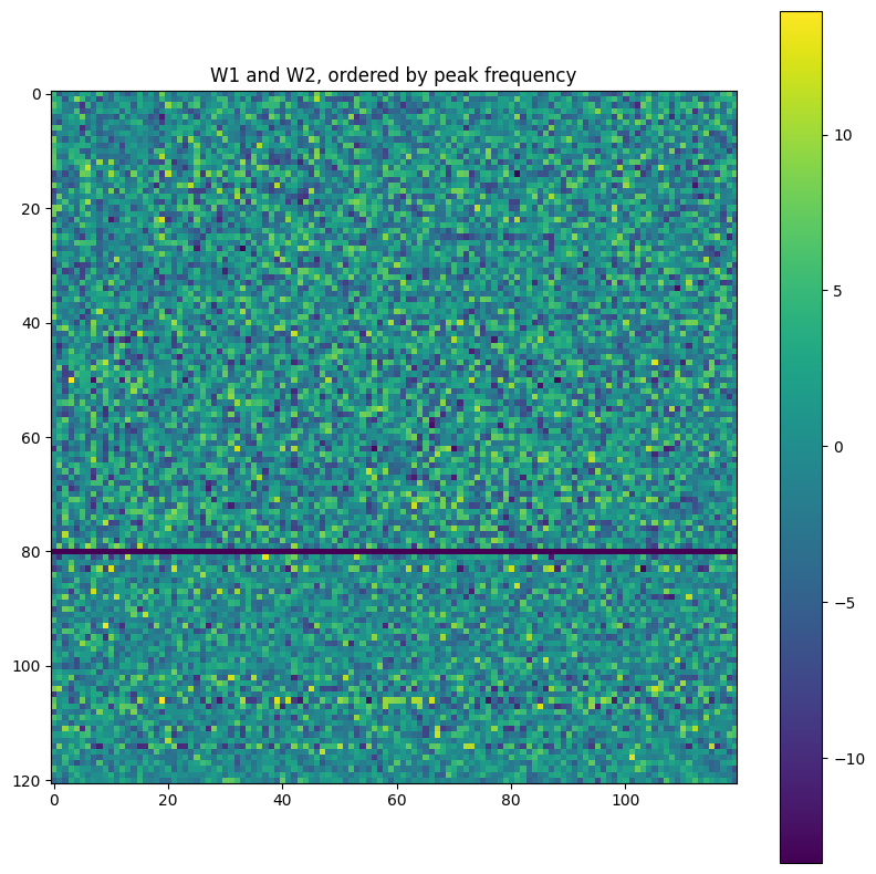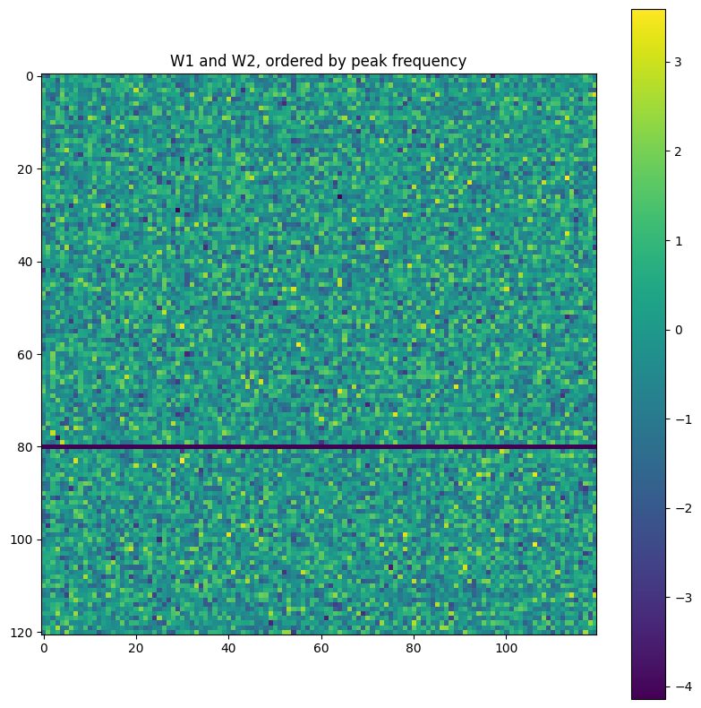 Directly inspecting the weight matrices, we notice suggestive wavy bands that resemble sine waves.