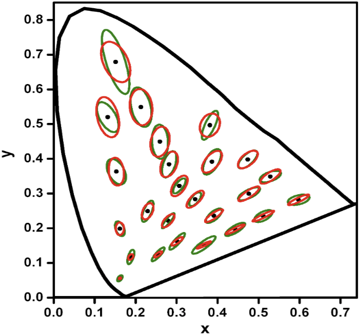 Consider a pair of pure spectral lights at 550 \;\mathrm{nm} and 554 \;\mathrm{nm}. For an observer with good vision, they are separated by a JND, so if the observer sees two patches of light shining on two plates of frosted glass placed close to each other, then the observer can just barely see that they are not the same color. However, as soon as the two lights are turned off, the difference disappears. The observer cannot recall one as “green-550” and the other as “green-554”. Both would be recalled as “kind of green”. Without literally holding up a patch of green-550 or green-554 as a ready reference, the observer cannot tell if a single patch of light is closer to green-550 or green-554. The observer cannot tune a laser by sight so that its color matches green-550 rather than green-554.