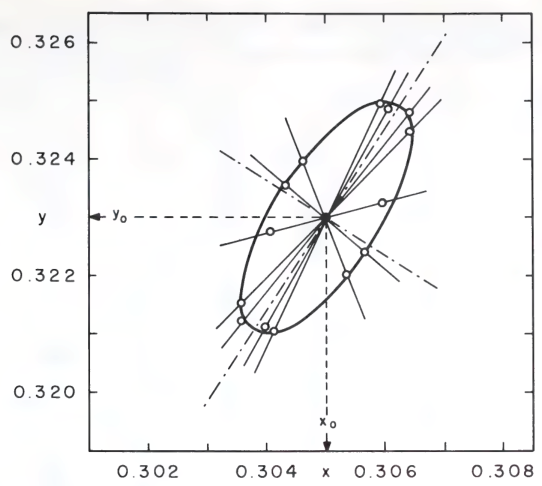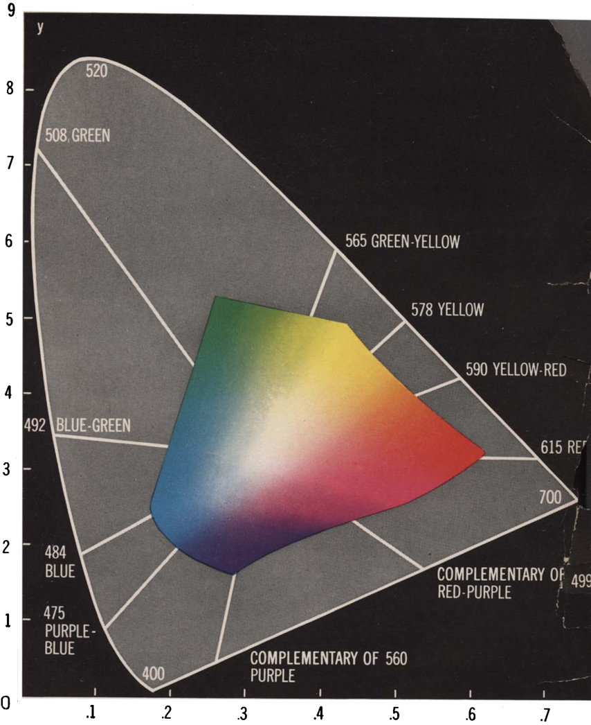 Thus, we can factor the space of colors into two components: an apparent lightness, and an apparent chromaticity. So, if we take two dim red lights, and shine both of them on the same pane of frosted glass, the frosted glass would look lighter, but have the same chromaticity. The space of chromaticities is the space of lines passing the origin, which allows us to use projective geometry.
