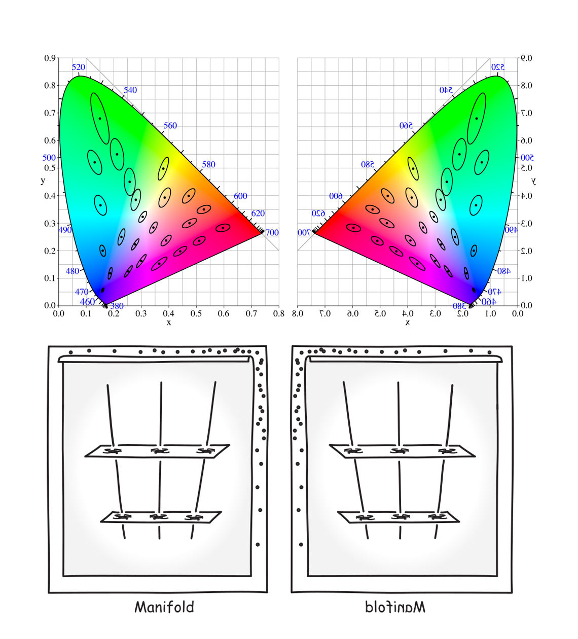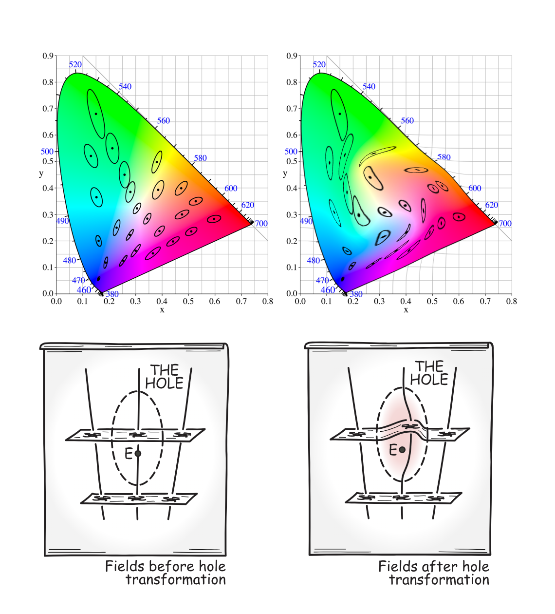 What dark phenomena do resemble, however, are the gauge-freedom conception of spacetime. The metric in color space is just like the metric in spacetime. Just like how the spacetime manifold is defined only up to gauge freedom, the color space is defined only up to diffeomorphism. Just like how the hole argument is dispelled by the gauge freedom viewpoint, the inverted or shifted qualia argument is dispelled if there is no ontological difference between diffeomorphically equivalent color spaces.