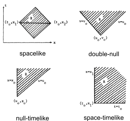 - make one lightcone plus a “left side” of the universe determine the rest (null-timelike, or Winicour–Tamburino),