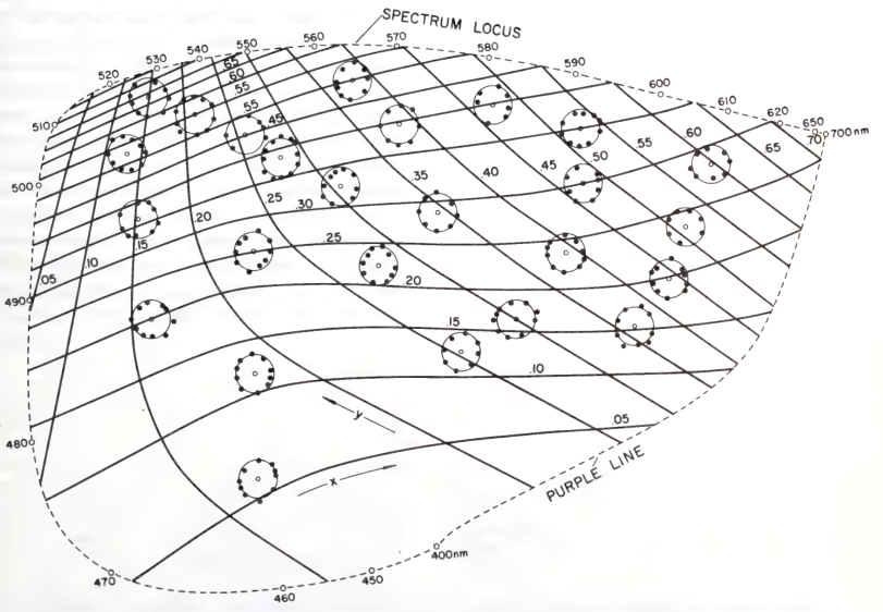 In short, people can distinguish many more colors when the colors are ready-present at eyes, than they can when the colors must be recalled from the brain. Indeed, according to experiments in the 1950s, though people can distinguish around 150 pure spectral colors in the sense of JND, they can identify only around 15 pure spectral colors in the absolute sense. (Halsey and Chapanis 1951)