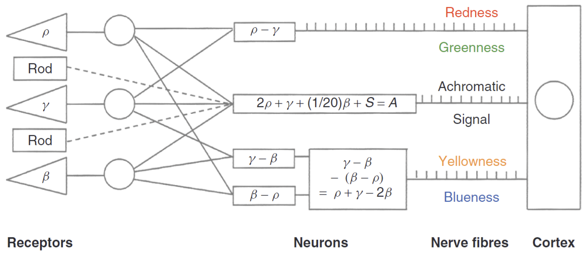 with type (\mathbb{R}^+ \to \mathbb{R}^+) \to (\mathbb{R}^+)^3, where \mathbb{R}^+ = [0, \infty) is the space of non-negative real numbers. Define this as the (I_S, I_M, I_L) as the LMS color space.4 Furthermore, the biochemical limit on neural firing is 1000 Hz (“Neuron Firing Rates in Humans” 2015), thus the LMS color space is bounded within a cube.