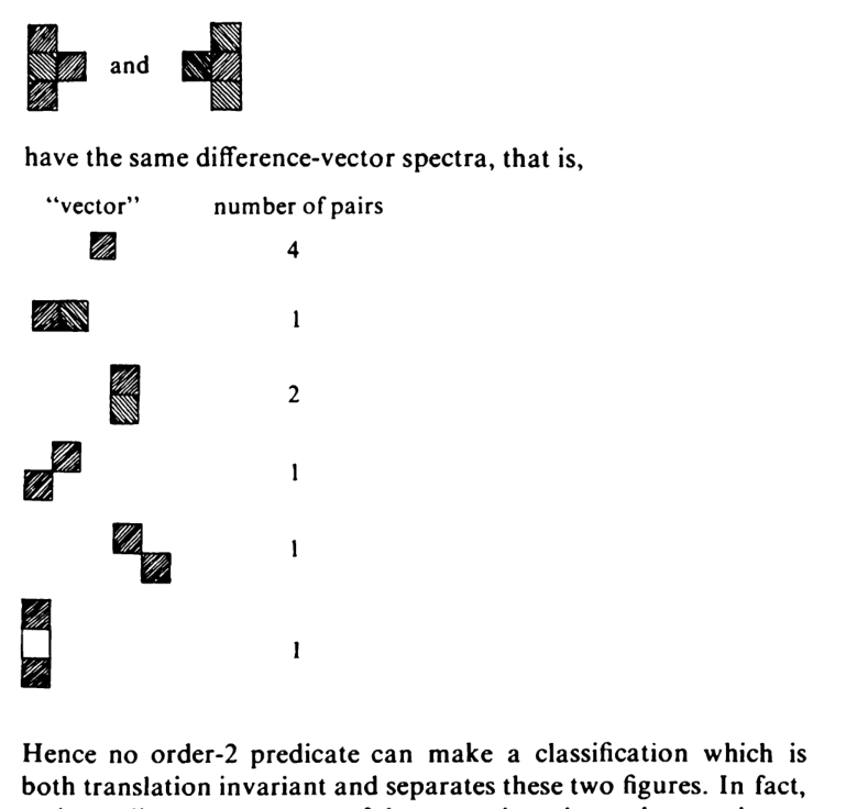 Chapter 6 develops the idea of “spectra” of images. For example, the following picture shows that if we were to design a perceptron machine using only masks of size up to 2, and translation-invariant weights, then it cannot possibly distinguish between the two tetris-like pieces, because both figures contain exactly 4 instances of single-square, 1 instance of two squares side by side, and so on.