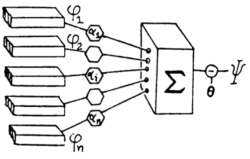 where \psi_1, \dots, \psi_k are (hidden) perceptrons in the hidden layer, and \psi_{k+1} is the single output perceptron.