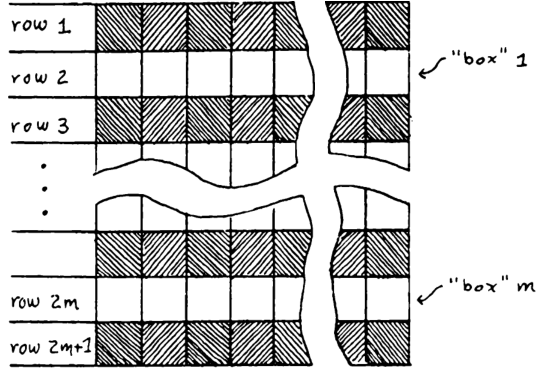 In the picture, the rectangle R has width 4m^2 and height 2m+1. We fill in all the odd-numbered rows, and use the machine to solve the one-in-a-box problem for the even-numbered rows. By Theorem 4, the machine has order \geq m = \Omega(|R|^{1/3}).