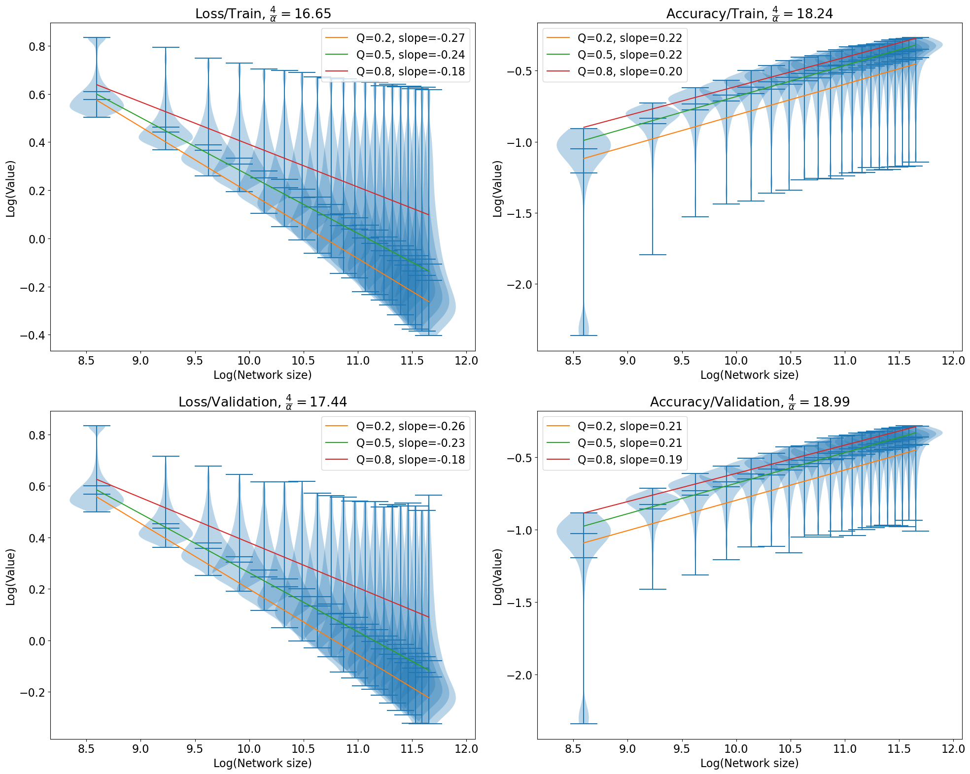 With these settings, I generated all the data and logged them into TensorBoard log files, then cleaned them up for quantile regression. Plotting in log-log scale, with the x-axis being the model parameter count, and the y-axis being the cross-entropy loss, we would get a downward sloping line. Our hope is that the line should have a slope of close to -4/d, where d \approx 17.