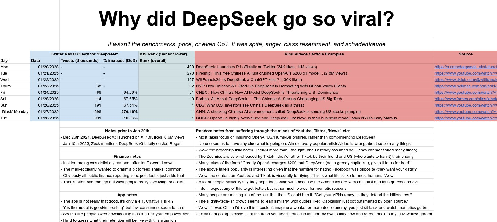 The separate analysis, on why DeepSeek hit No. 1 on the Apple App store so quickly after release,1 seems true enough to me. Such rapid rise must be a memetic virus, something like TikTok and YouTube Shorts. The app is good, the model is great, but that’s not enough to push the app to No. 1 out of nowhere. The general public knew nothing of DeepSeek; DeepSeek made no advertisement; etc.