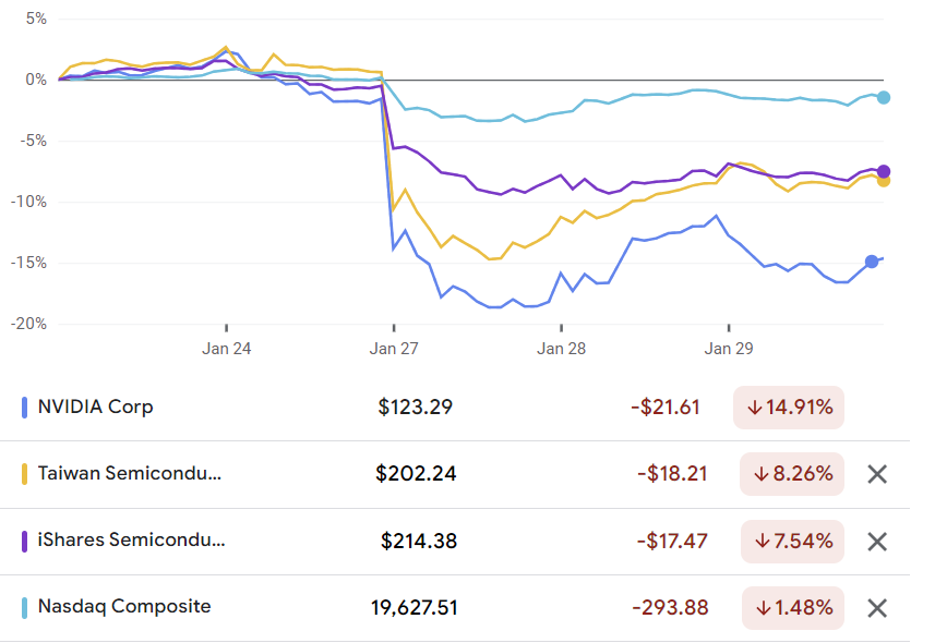 On 2025-01-27 on the New York Stock Exchange, multiple semiconductor corporations gapped down. The cause is clear: something about DeepSeek-R1. What that something is, I don’t know.