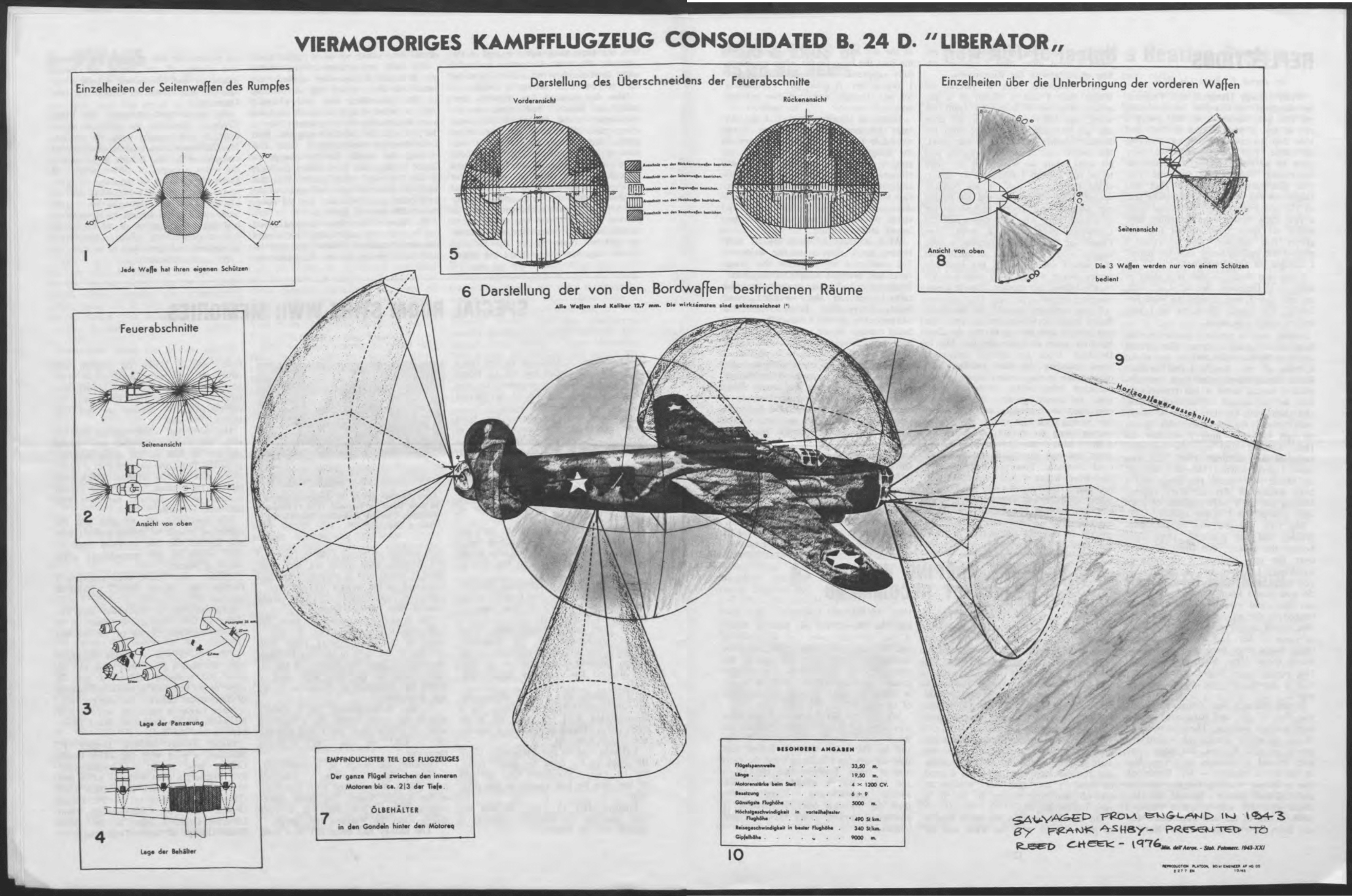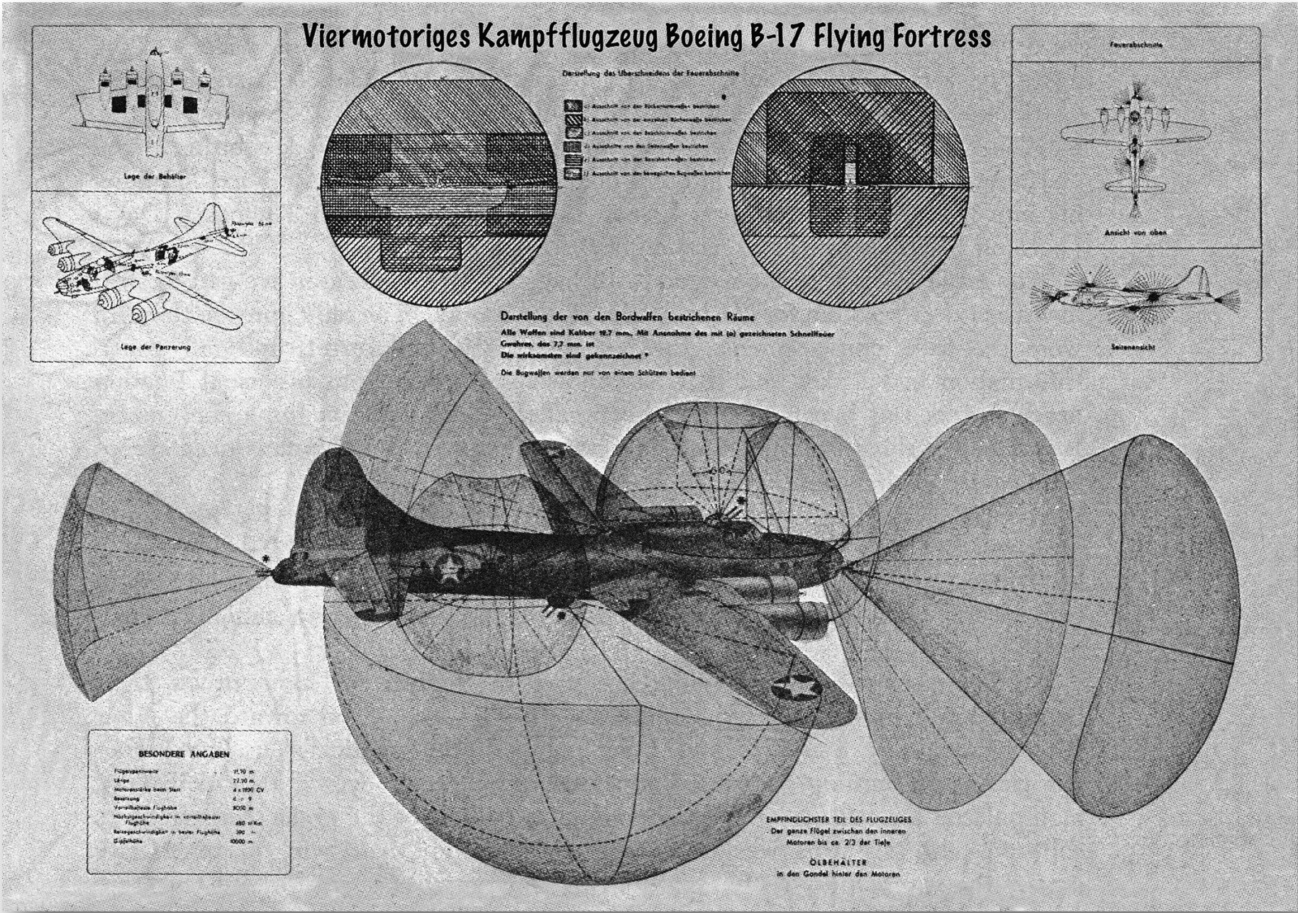 A German instructional poster for training the Luftwaffe. The shapes indicate areas of fire from the 50mm gunner positions aboard the B-17. Also noted are susceptible locations, specifically the fuel and oil tanks on the Flying Fortress. The text is murky but what I can make out are “Darstellung der von den Bordwaffen bestrichenen Räume”, “Darstellung des Uberschneidens der Feuerabschnitte”, “Viermotoriges Kampfflugzeug Boeing B-17 Flying Fortress”. [“Representation of the areas covered by the on-board weapons”, “Representation of the overlap of the fire zones”, “Four-engine fighter aircraft Boeing B-17 Flying Fortress”].