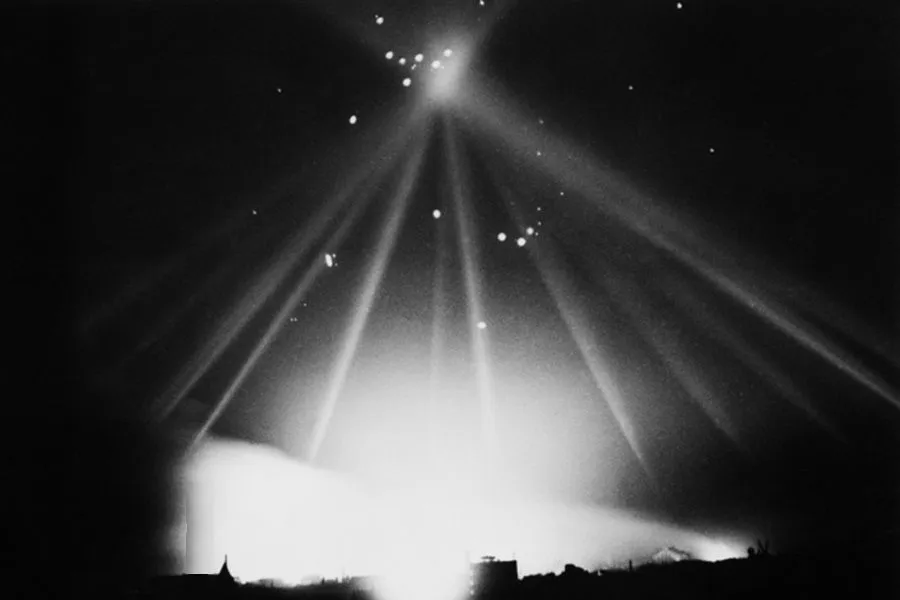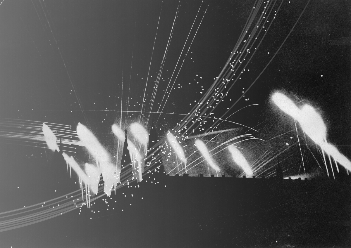 Operation Gomorrah with Avro Lancaster bomber, 30/31 January 1943-01-30. The bright sine-like curves are flares, while the smoke and explosions provide diffuse lighting. Source: C 3371 of the Imperial War Museums.