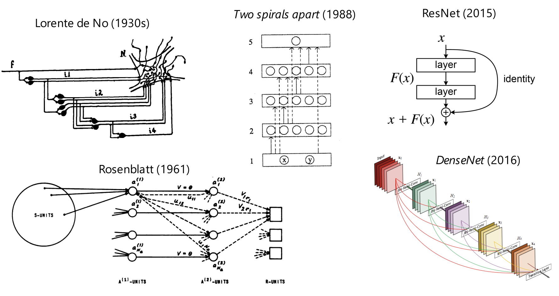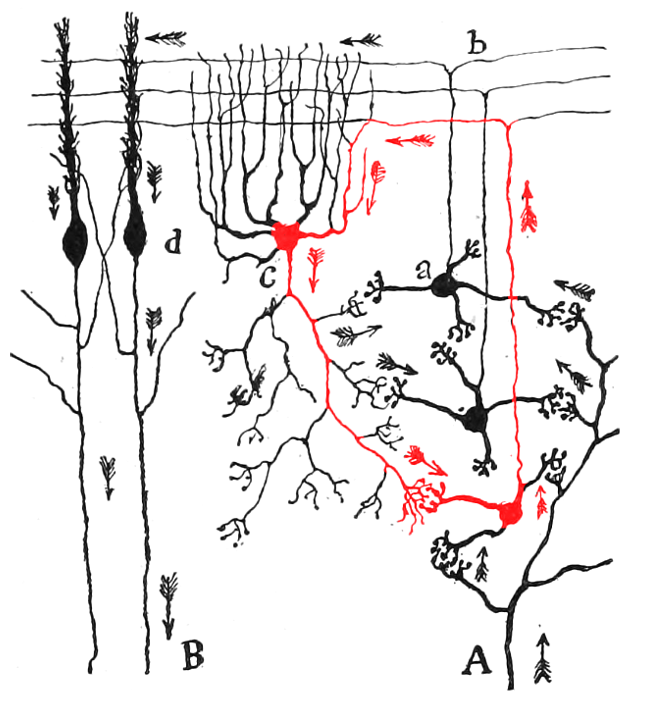 Cajal’s neural network diagrams are always feedforward. Cajal never depicted feedback except once, in a diagram of a connection in the cerebellum. In fact, according to de No, who was a student of Cajal, Cajal was vehemently against feedbacks. More on this later.