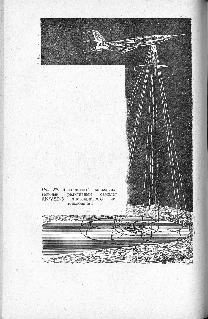 Cybernetics in Military Affairs. USSR, Moskva, “DOSAAF” (M. N. Goncharenko, 1963). The image shows a Tupolev Tu-123 reconnaissance drone. Книга М. Н. Гончаренко “Кибернетика в военном деле”. СССР, Москва, “ДОСААФ” 1963 год. The original caption says “Puc. 39. Беспилотный разведывательный реактивный самолет AN/VSD-5 многократного использования.” [Fig. 39. AN/VSD-5 reusable unmanned reconnaissance jet aircraft.]