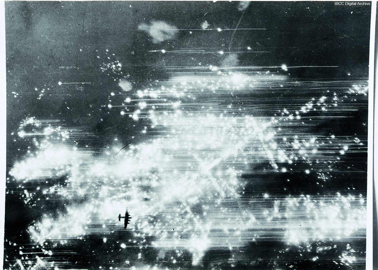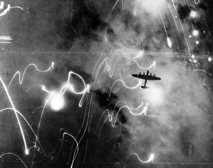 A night bombing raid on Bremen. A British bomber has been caught in the searchlight cone and heavy anti-aircraft fire is converging on the aircraft. Source: Australian War Memorial