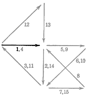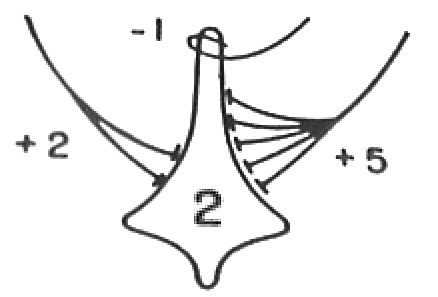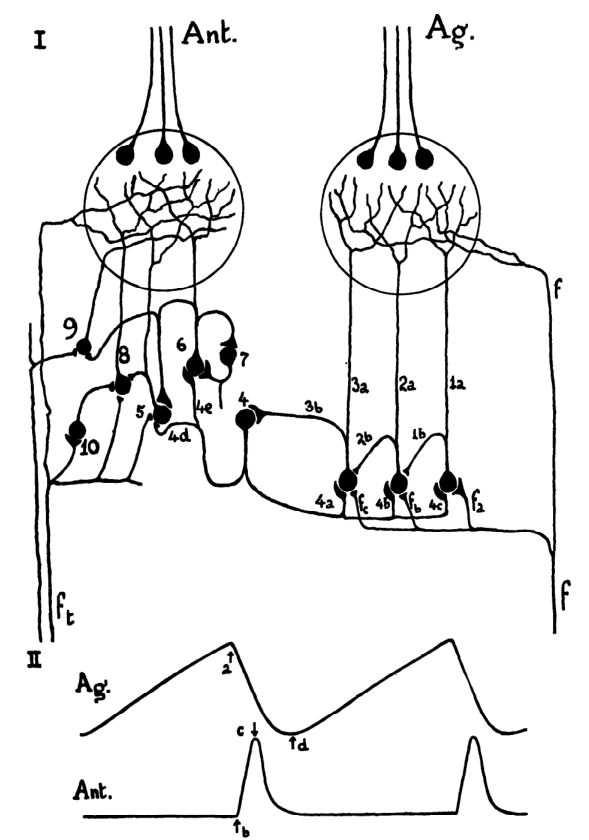 A recurrent neural network that explains nystagmus. (de Nó 1938, fig. 13) Original caption: Diagram explaining the production of rhythm during vestibular nystagmus. Fiber f is sup- posed to carry the continuous series of impulses started at the cristae of the semicircular canals which set up the nystagmus. Fibers ft are supposed to be maintaining the tonus of the antagonistic muscle; la, Ib, Za, Zb, 3a, 3b are branches of the axons of cells 1, 2 and 3,4a, 4b, 4d,, 4e are branches of the axon of cell 4; fa, fb, fc are branches of fiber f. II. Diagram of the rhythmic succession of con- tractions and relaxations of the antagonistic muscles during the nystagmus explained by diagram I. Rising of the line indica tes contraction . The interval between turning points a and b is never less than 3 to 4 msec.; – the interval between 50 msec. long.