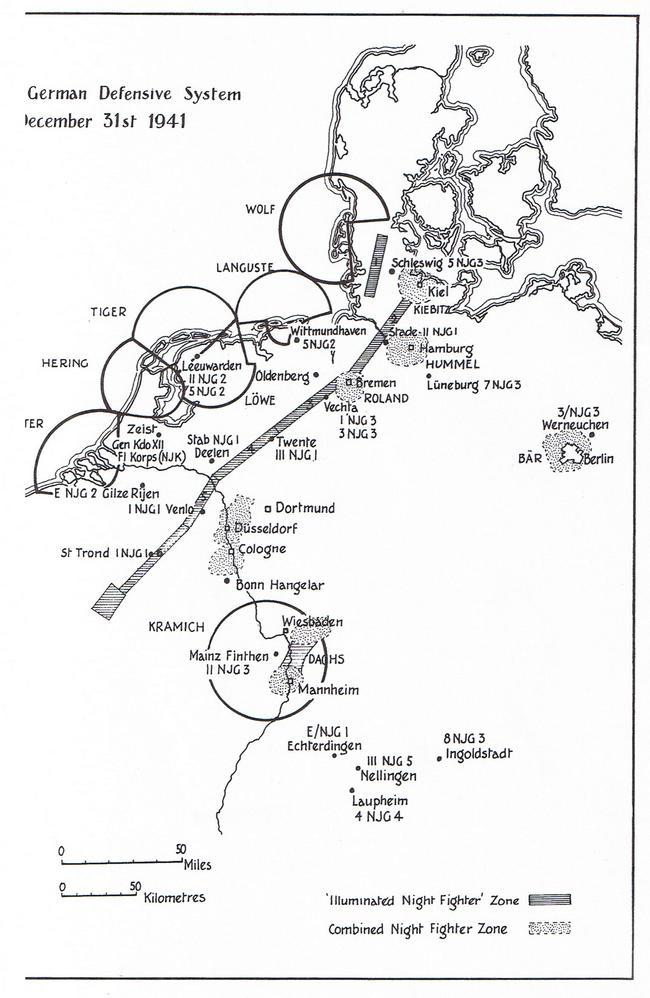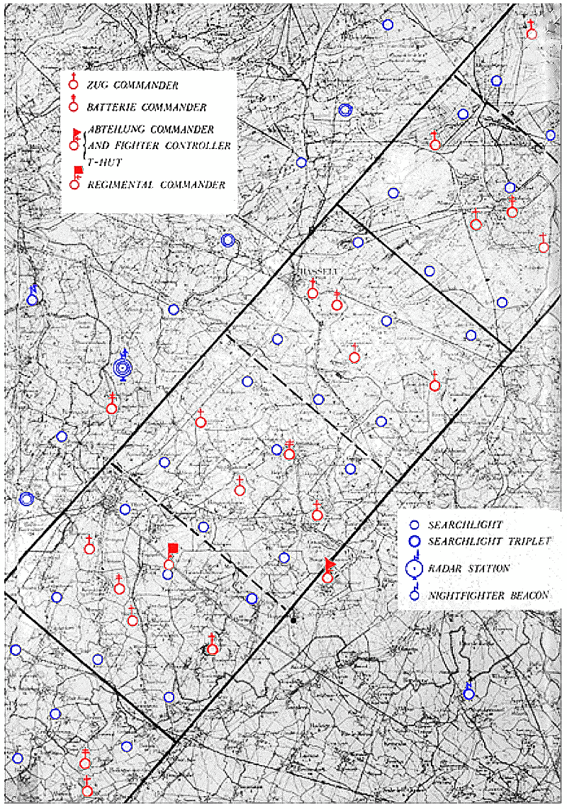 Map of the Kammhuber line, a defensive front against British bombers. It consisted of a series of control sectors equipped with radars and searchlights and an associated night fighter. Each sector would direct the night fighter into visual range to target intruding bombers.