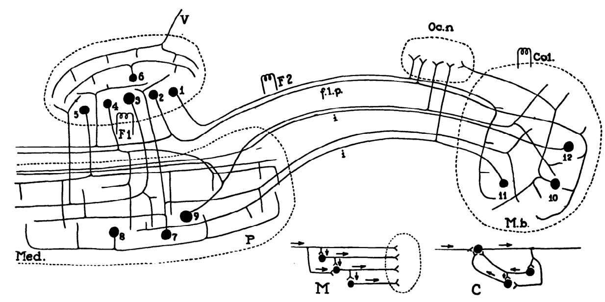 Simplified diagram of the interneurons in the vestibulo-ocular reflex, showing both residual feedforward connections and recurrent connections. (de Nó 1938, fig. 2) Original caption: Diagram of the pathways connecting the internuncial cells among themselves and with the ocular motoneurons. V, vestibular nerve; 1 to 6, cells in the primary vestibular nuclei; 7, 8, 9, cells in the reticular formation in the medullar (Med.) and pons (P.); 10, 11, 12, cells in the reticular nuclei in the midbrain (M.b.); Oc.n., oculomotor nuclei; f.l.p., fasciculus longitudinalis posterior and similar pathways; i, internuncial pathways; Fl, F2 and Col., position of the stimulating electrodes. The diagrams below indicate the two types of chains formed by internuncial cells; IV, multiple and C, closed chain.