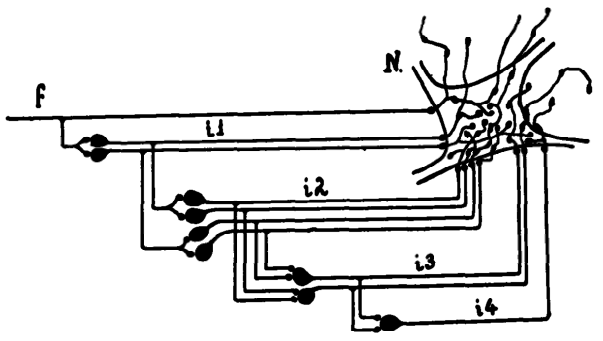 Oculomotor of the rabbit. (de Nó 1938, fig. 3) Original caption: i1, i2, i3, i4, intemuncial paths. Passage of a synapse means a delay of about 0.6 msec. Note that each fiber has several synaptic knobs on the neuron, an arrangement increasing the possibility of spatial summation.