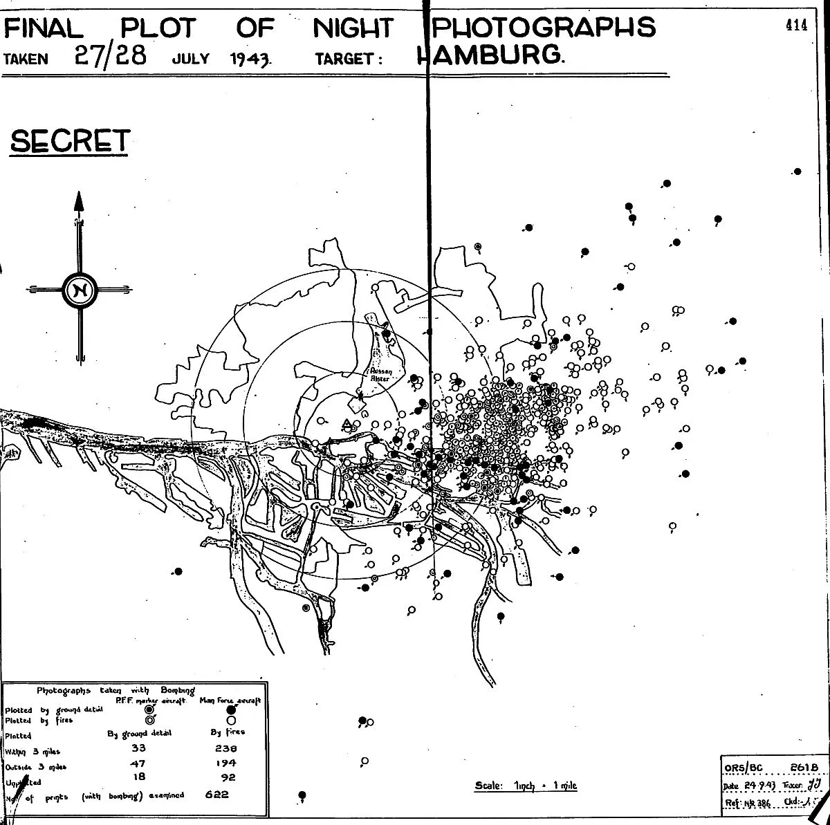 Scatterplot of photos taken from bombers during Operation Gomorrah bombing of Hamburg, 1943-07. It was standard practice to take photos from bombers to validate the bombing accuracy, benchmark the loss function, measure the ablation of the target, and plan the next attack.