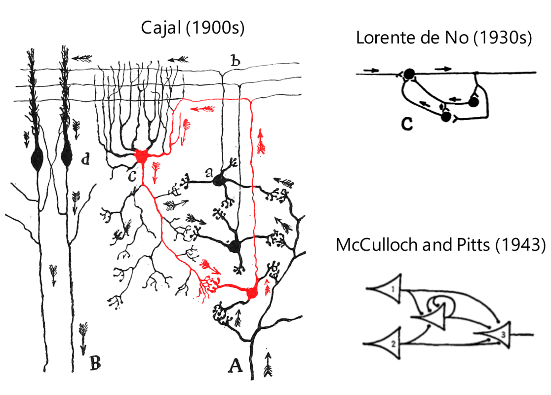 Lorente de No was at the founding of cybernetics, and went to the Macy conferences a lot. He consistently pointed out that recurrent networks exist in the brain and is possibly responsible for transient memory. He had influenced many of the early cyberneticians, including Hebb, McCulloch, and Pitts. (Espinosa-Sanchez, Gomez-Marin, and de Castro 2023)