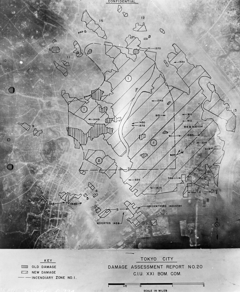Damage Assessment Report No. 20. Mosaic map showing target area and extent of Tokyo bombing caused by the 1945-03-10 raid – Source: U.S. National Archives, Record Group 243, Series 59, Box 6.