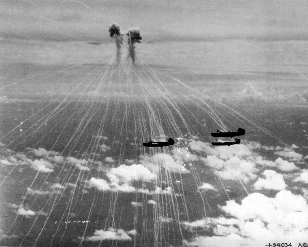 Japanese Mitsubishi A6M Zero drop white phosphorous air-burst bombs on B-24 Bombers over Iwo Jima, 1945-02. Apparently those were used during the Battle of Iwo Jima as a crude anti-bomber attack. The information is scarce, but there is a video Pacific Jap Phosphorous Bombs demonstrating it.